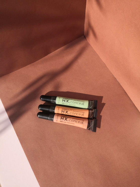 کانسیلرهای هایکپیِ huxybeauty در 3 رنگ سبز، هلویی روشن و هلویی متوسط.